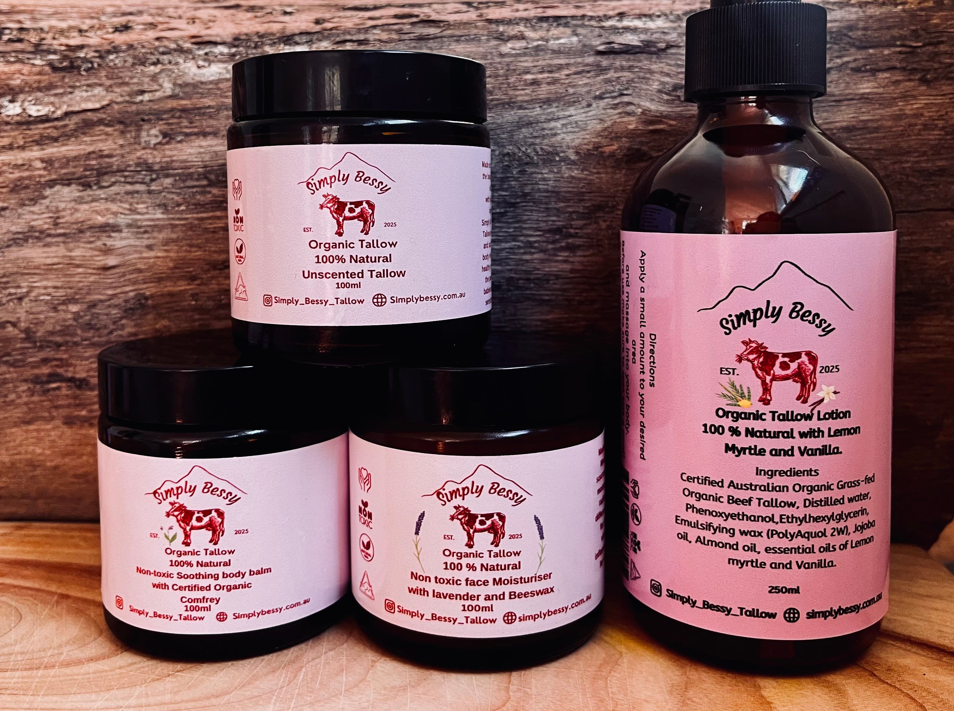 Simply Bessy tallow is sourced BYRON BAY TALLOW who is partnered with ethical Australian farms in Queensland, New South Wales and Victoria. All Tallow is certified organic, grass-fed, and free range.